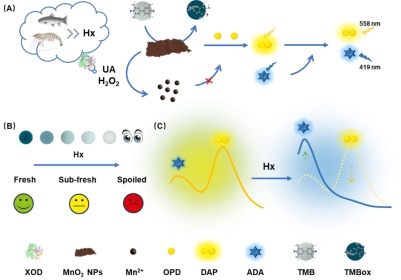 近期,伟德BETVLCTOR1946王晓琨副教授团队在水产品新鲜度评估领域取得了重要进展。团队创新性地开发了一种基于催化反应的次黄嘌呤(Hx)比色-比率荧光双模式检测方法,实现了水产品新鲜度的快速、灵敏、可靠评估。研究成果以题为《The colorimetric and ratiometric fluorescence dual-mode detection of hypoxanthine through catalytic reactions for assessing aquatic product freshness》的研究论文,发表在国际著名期刊《Food Chemistry》(一区Top,IF=8.5)。