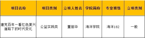 海洋学院海洋科学专业182班董丽华同学的公益实践类项目“建党百年—看红色复兴道路下的时代变化”获学校2021年员工发展性资助项目一般立项。