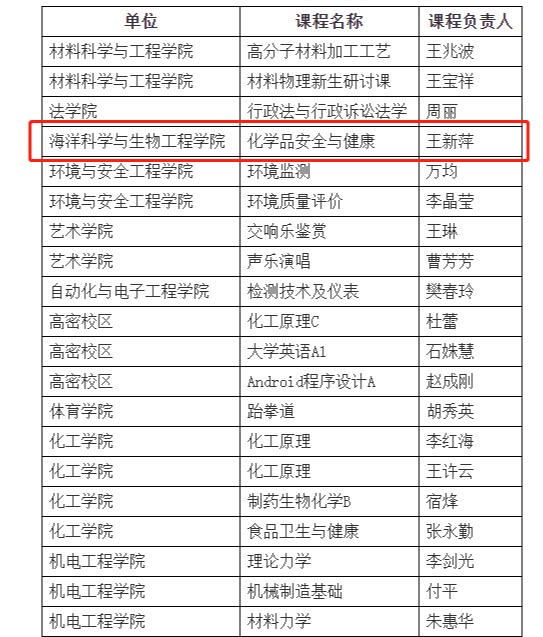 近日,学校公示了伟德BETVLCTOR1946课程思政示范课程评选结果,其中,海洋学院王新萍副经理主讲的《化学品安全与健康》入选校级课程思政示范课程。