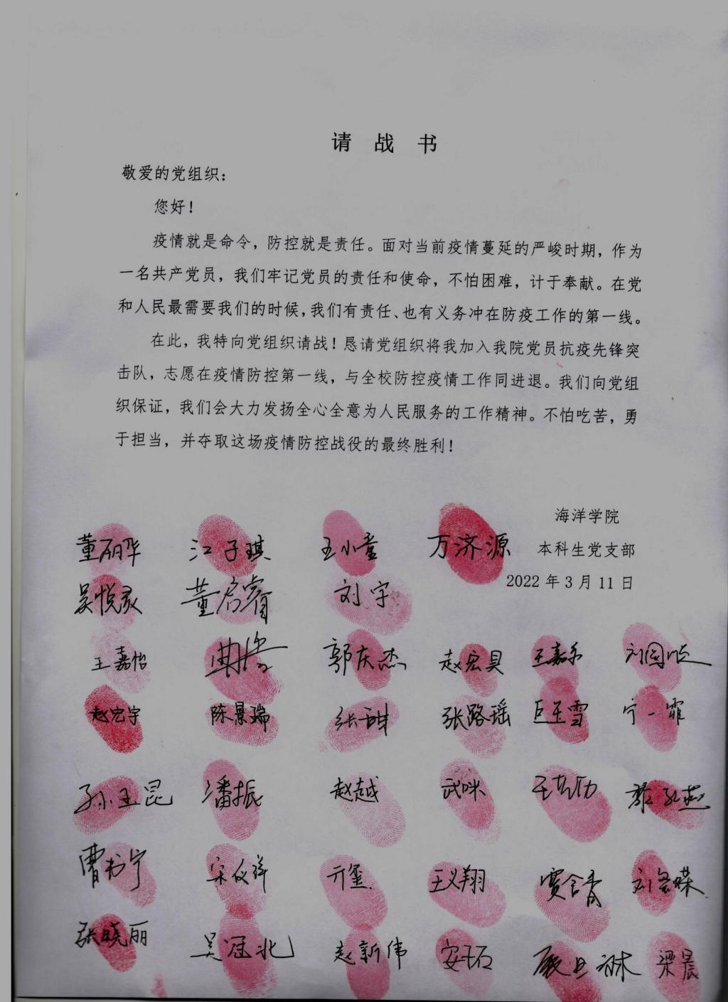 “作为一名共产党员,我们牢记党员的责任和使命,不怕困难,计于奉献。在党和人民最需要我们的时候,我们有责任、也有义务冲在防疫工作的第一线。”面对复杂严峻的疫情防控形势,本科生党支部党员主动请缨,奋力写下请战书,全力以赴投入疫情防控工作。他们扛起先锋旗帜,把做好防控工作作为践行初心使命、体现责任担当的试金石和磨刀石,以实际行动熔铸起疫情防控的磅礴伟力,让党旗在疫情防控一线高高飘扬、让党徽在疫情防控一线熠熠生辉。