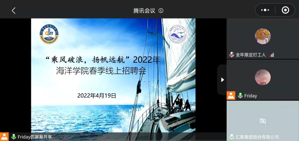 为促进毕业生与用人单位实现供需有效对接,推动毕业生及早就业、高质量就业,4月19日下午,海洋学院举办“乘风破浪、扬帆远航”2022届毕业生春季线上招聘会。