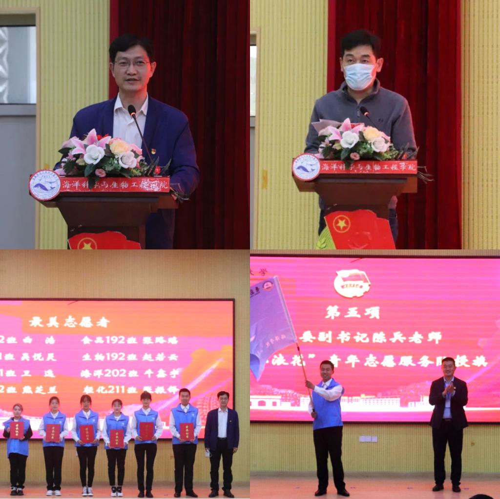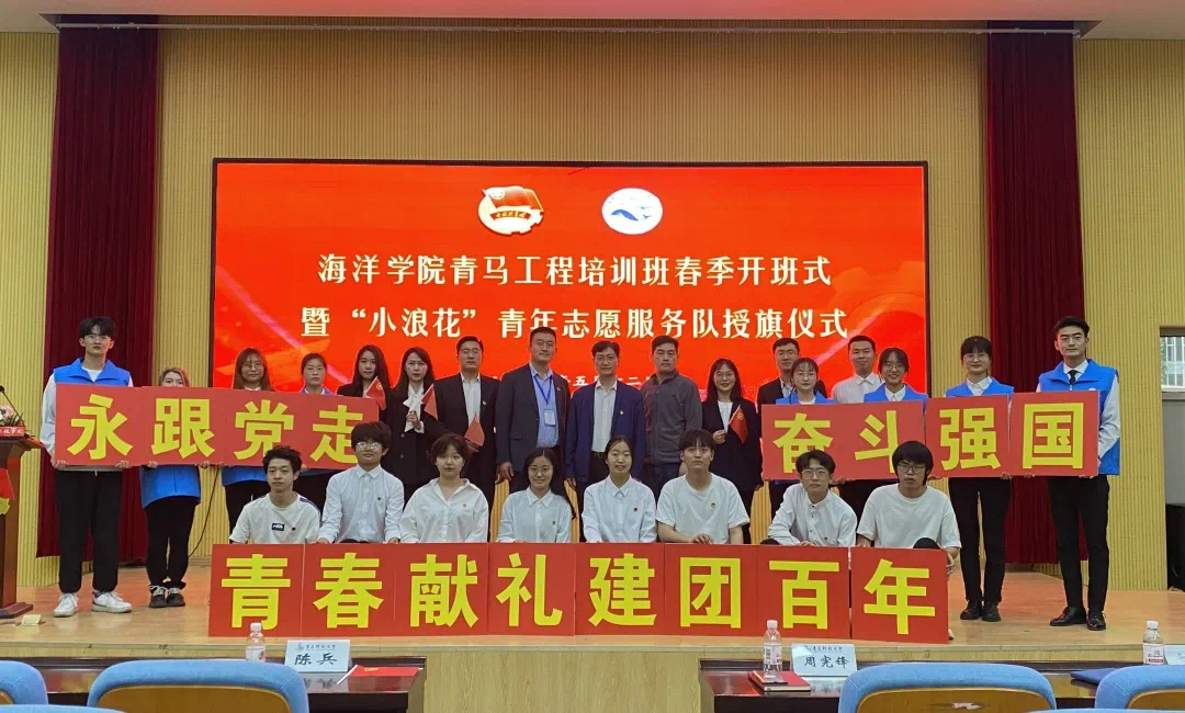 为深入学习贯彻习近平总书记在庆祝中国共产主义青年团成立100周年大会上的重要讲话精神,培养思想坚定、素质过硬、能力突出、格局远大的青年马克思主义者,5月12日下午,海洋学院“青马工程”培训班春季开班仪式暨“小浪花”青年志愿者服务队授旗仪式在四方校区讲学厅举行。校团委副书记陈兵、公司党总支书记周宪锋、党总支副书记兼副经理臧传永、全体专兼职辅导员以及部分员工干部、员工志愿者参加活动。