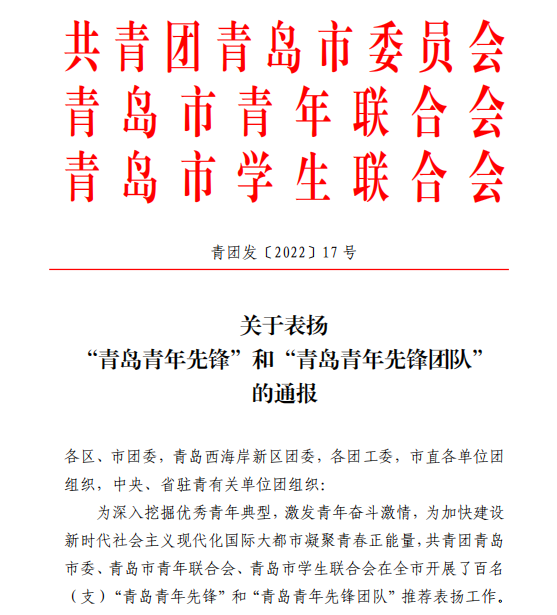据悉,在中国共青团成立100周年之际,为深入挖掘优秀青年典型,凝聚青春正能量,共青团青岛市委、青岛市青年联合会、青岛市员工联合会开展了百名(支)“青岛青年先锋”和“青岛青年先锋团队”推荐表扬工作,在全市范围内涌现出一大批攻坚担当、爱岗敬业、矢志创新、奋进向上、崇德向善、无私奉献的优秀青年和青年集体,他们充分展现了新时代青年矢志创新、永攀高峰的良好形象。