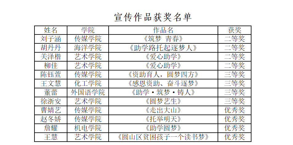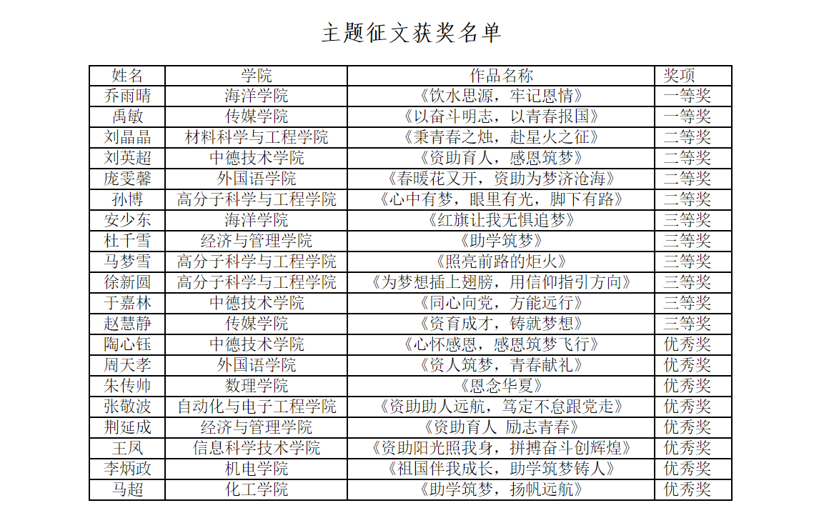 根据学校《关于开展2022年员工资助育人系列主题活动的通知》要求,海洋学院积极组织,号召员工参与活动。经学院(校区)推荐、资格审核、学校评审,海洋学院生物212乔雨晴荣获主题征文一等奖 ,生物212安少东荣获主题征文三等奖 ,生物212胡丹丹荣获宣传作品二等奖。