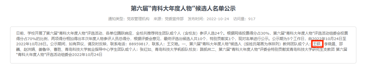 日前,学校开展了第六届“青科大年度人物”评选活动,各单位踊跃响应,全校共推荐师生团队或个人(含员工)参评人选24个,最终评选出候选人共10个,特别贡献奖1个。海洋学院教师王硕获评第六届“青科大年度人物”。