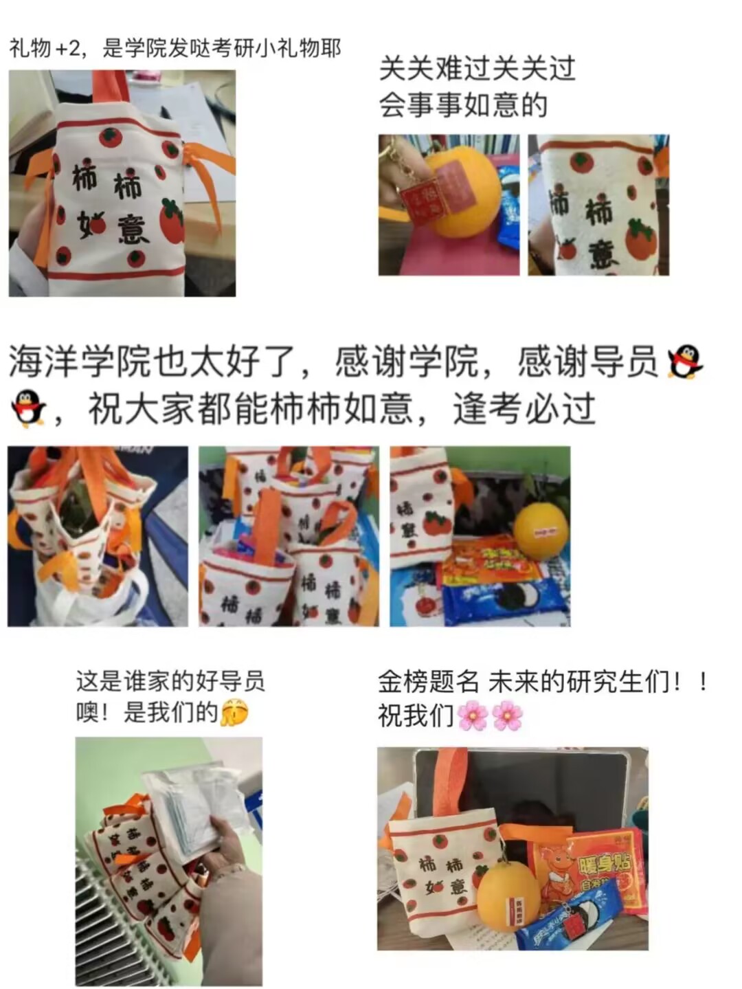 拎着手中爱意满满的礼包,倾听着老师们鼓励的话语,海洋学子们备受振奋,纷纷表示非常感谢学院和老师的鼓励和关爱,一定会不负众望、全力以赴,以最好的状态迎接考试,以优秀的成绩回馈学院。